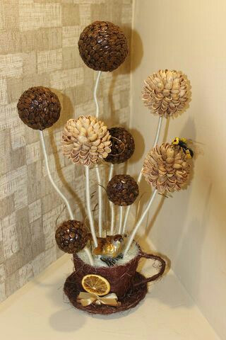 Materiales: Esferas de unisel o icopor en varios tamaños, alambre grueso, una base o maceta de material pesado (de cerámica, barro o vidrio), un trozo de foam o espuma floral, hilo rústico o cuerda delgada, semillas (ejemplos: granos de café, semilla de calabaza, semillas de girasol, cascaras de pistachos, frijoles, etc), pintura en spray o aerosol, pistola de silicón, musgo o follaje (opcional)