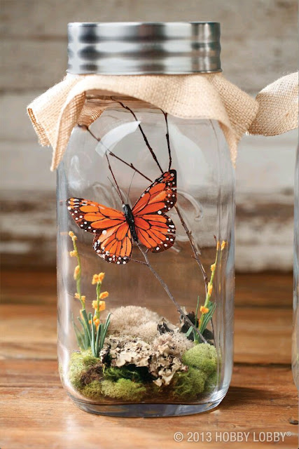 Mira estas bellas decoraciones hechas con mariposas en interior de recipientes de vidrio como frascos o floreros. Hacerlas es muy fácil: comienza por pegar mariposas de papel o tela en ramitas secas de árbol (también puedes usar alambre delgado) Prepara el fondo del recipiente pegando un poco de espuma floral (foam u oasis) y agregando elementos naturales como musgo seco, piedras, hojas etc. Clava las ramitas con las mariposas en la espuma floral y cierra el frasco. Puedes usar diferentes soluciones para sujetar las ramitas, como colocar una pequeña maceta en el interior o usar una pequeña base de madera. Otra opción interesante es invertir los recipientes y trabajar directamente sobre la tapa. Inspírate con estas bellas ideas: