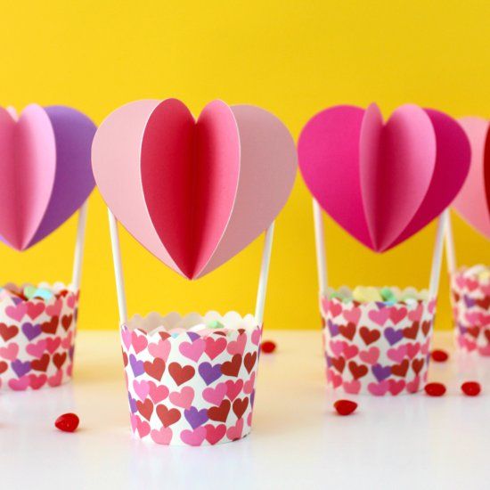8.- Corta cuatro trozos de cinta o listón del mismo tamaño (deben ser lo suficientemente largos para ir desde la base hasta los corazones) y pégalos en las orillas de manera simétrica en el interior del recipiente.